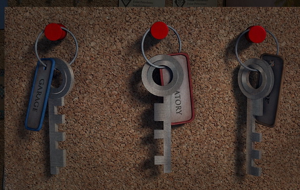 Идем на кухню и общаемся с нашими знакомыми. Спешим в гараж, где разговариваем на все темы с Тедом. Переходим в лобби, снимаем со стены ружье и поднимаем с пола веревку. Забираем с собой нефтяной зонд, который упирается о шкаф с одеждой. Возвращаемся в комнату и кладем в инвентарь обувь с шипами (crampons - "кошки"), которая висит на стене. Теперь нам нужно сделать универсальный ключ, с помощью которого мы попадем в комнату Новы. Заготовка ключа у нас уже есть в инвентаре, осталось лишь узнать, как он выглядит. Выходим в коридор и осматриваем деревянный стенд на стене. Щелкаем по трем ключам на стенде:Наша задача: объединить выемки на всех трех ключах. В инвентаре комбинируем набор универсальных инструментов (брелок) с заготовкой ключа. Обращаем внимание, что ключ состоит из 9 частей. Если щелкнуть на любую из частей, то мы сделаем выемку. В результате складывания выемок на всех трех ключах приходим к выводу, что нам нужно оставить "зубок" лишь на пятой части ключа. Поэтому щелкаем по следующим частям ключа: 1, 2, 3, 4, 6, 7, 8, 9.
